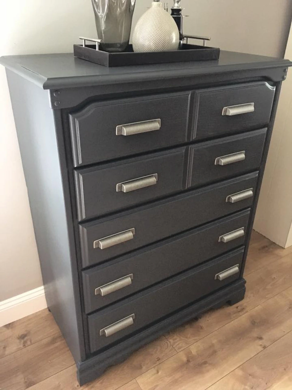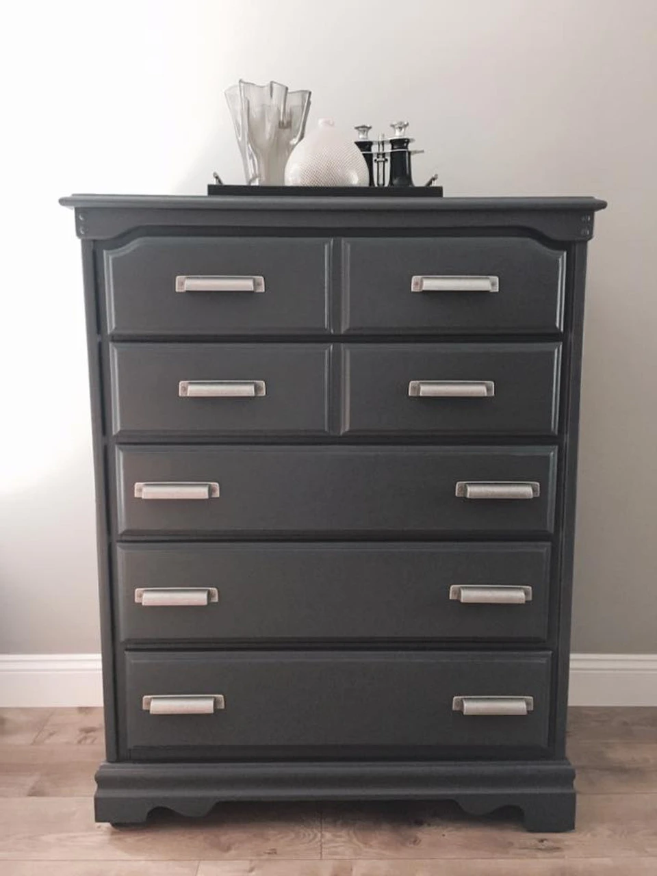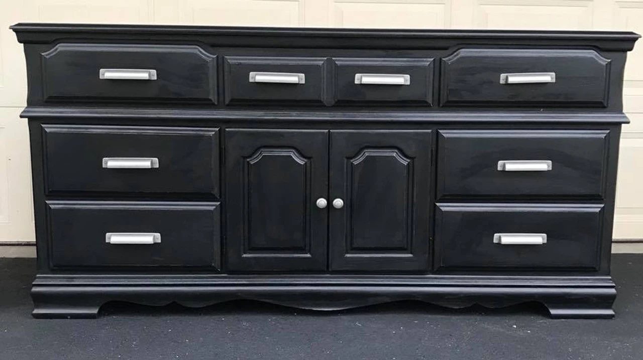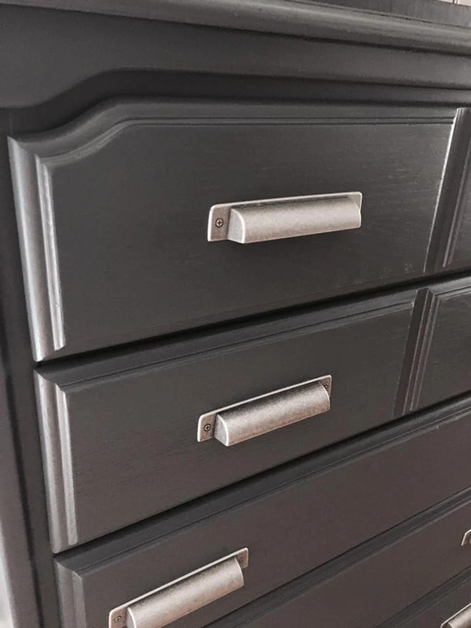 The Ironcraft Bin Pull celebrates the design detail of the craftsman era. Perfect for traditional, casual or rustic cabinetry or furniture. Crafted from die-cast zinc for long lasting quality and durability. Installation hardware is included for you. Lucky us to have some nice photos of this bin pull in use from Erica at ReCreated! Furniture & Home Decor on one of her latest dresser makeovers! And a second set of photos on a matching bedroom set from KnockOut Home!
