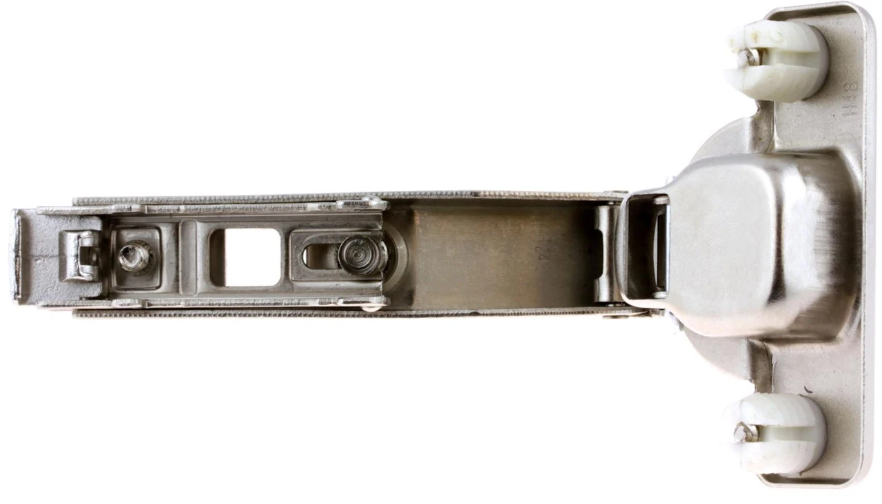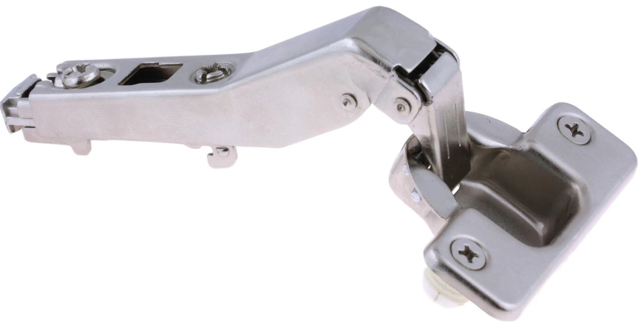 45 Degree Corner Hinge and Mounting Plate Concealed self-closing Euro Hinge Easy Clip type Angled arm to allow the hinge to be mounted on the side gable Fits beveled or square cut gable.