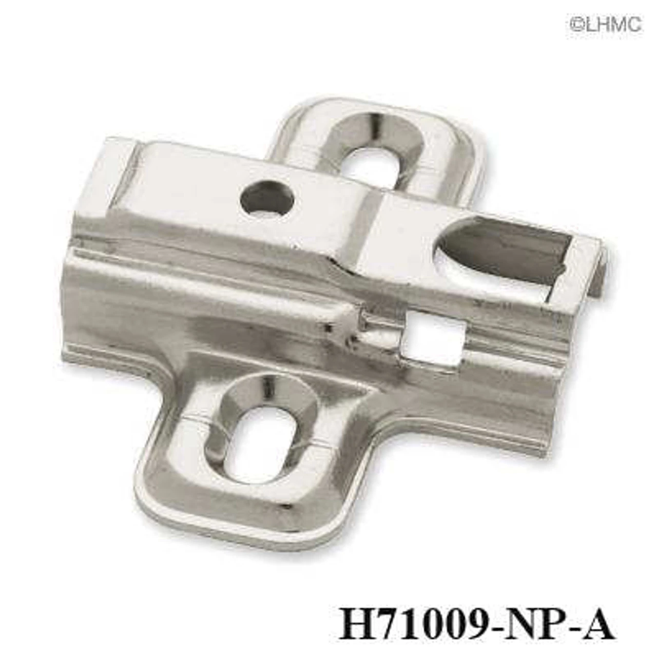 This mounting plate is part of the Liberty Easy-Clip concealed hinge system. The mounting plate is for 35mm hinges and requires wood screws. This mounting plate has a 4 mm rise, which reduces the overlay by 4 mm. Overall dimensions are 1-11/16″ length x 2″ wide x 1/2″ height of end with open hole on top.