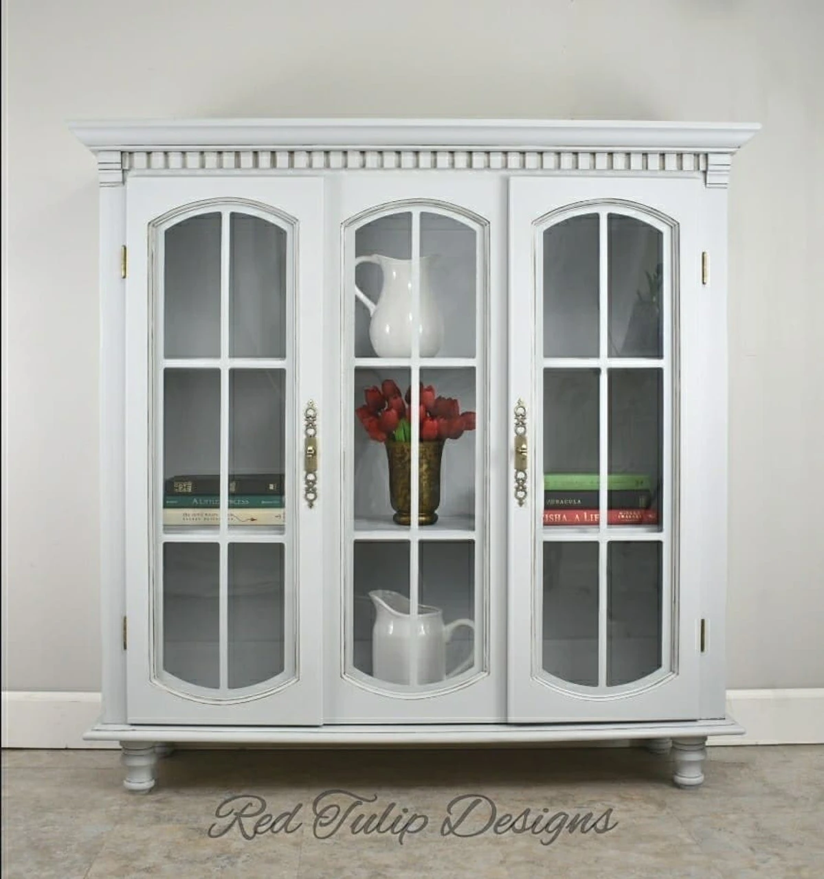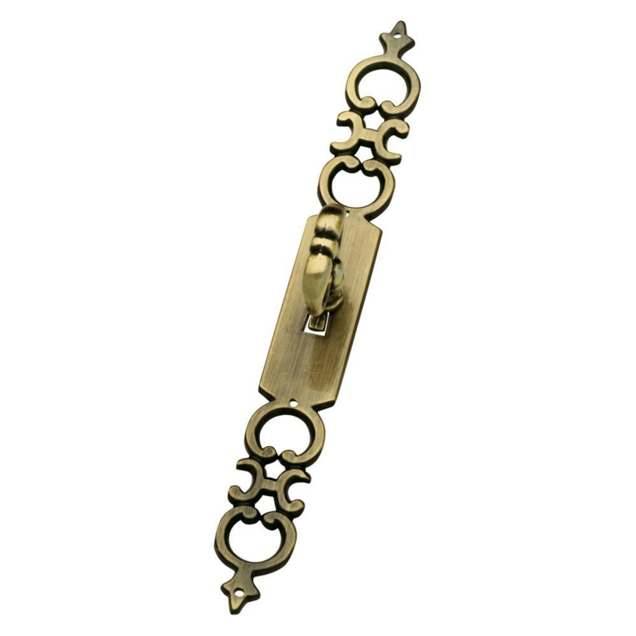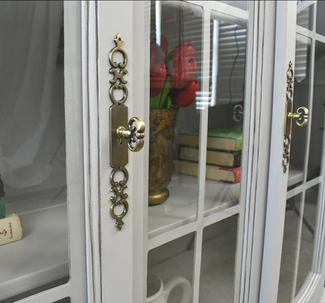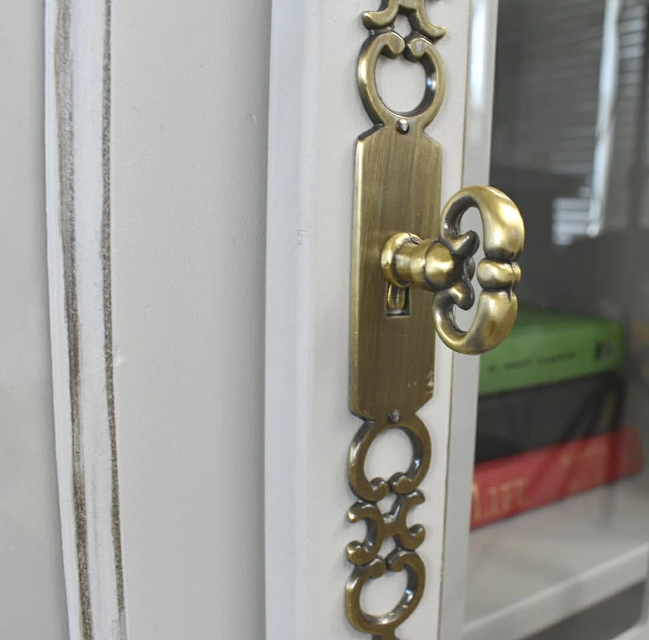 Knob is in the shape of a key and backplate has escutcheon features making this knob and backplate combo look like a vintage replica in antique brass. Big thanks to Kim from Red Tulip Designs for the extra photos showing off this nice knob and backplate combo on a gorgeous china cabinet. Perfect for large pieces!