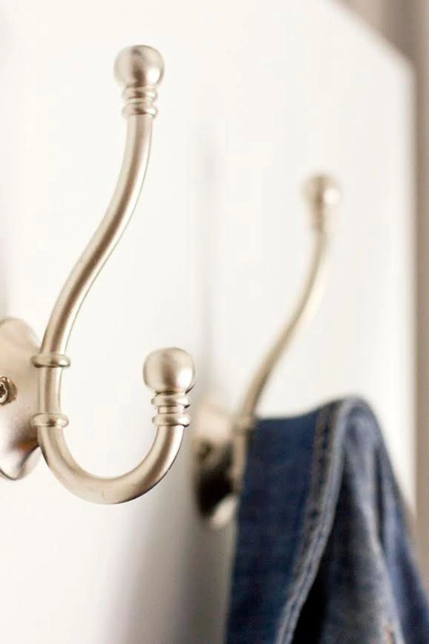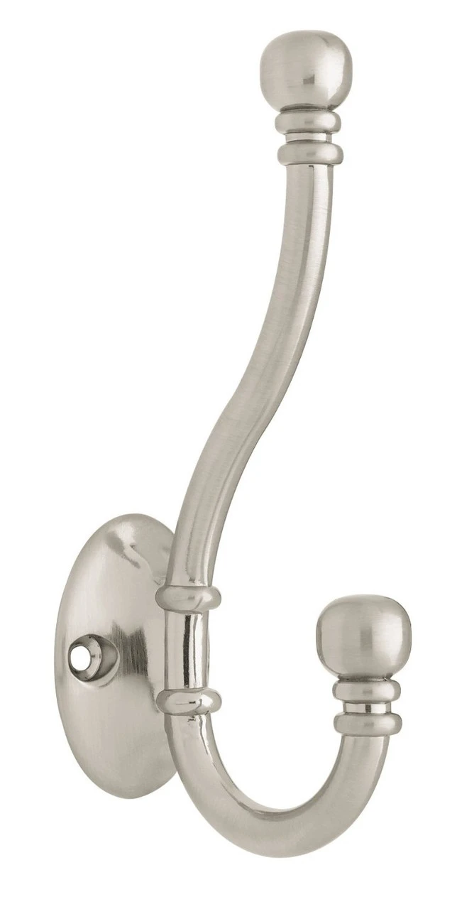 Ball end two prong coat hook front mount satin nickel. Recommended weight 35 lbs. Similar to Liberty B46305-SN-CE. We got some nice shots of this photo in use from the blog Small Stuff Counts as you can see in the additional images. The image on the far right is from Apline Wine Design’s collection. We have two more shots from a good customer at Appletree Woodcrafts out of Defiance, OH! They have a 5 star rated Etsy shop selling all sorts of hook racks and other custom woodwork.
