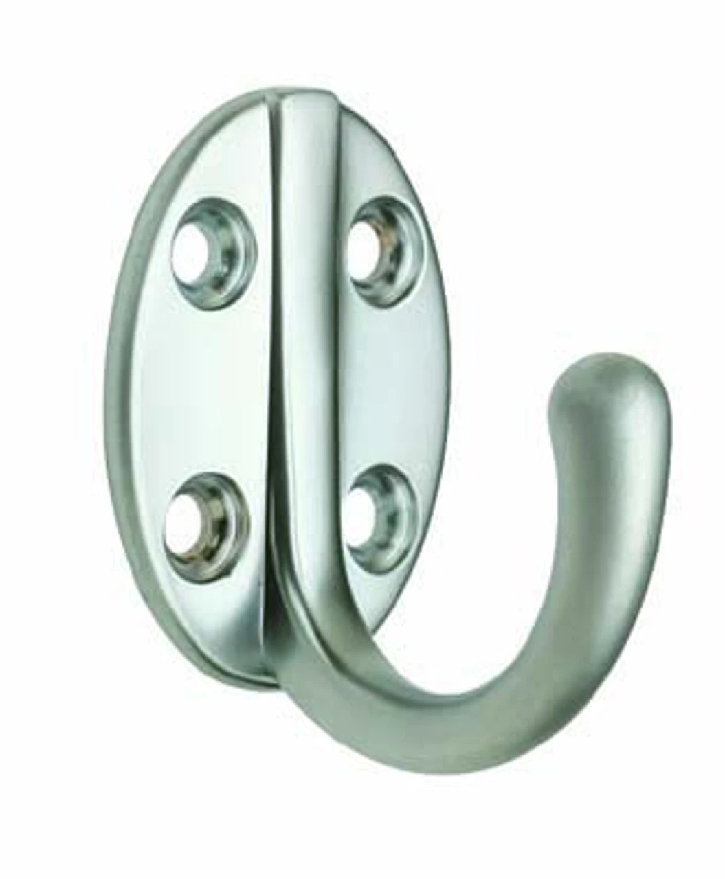 Aluminum finished die cast single coat hook with round base. Comes with mounting screws.