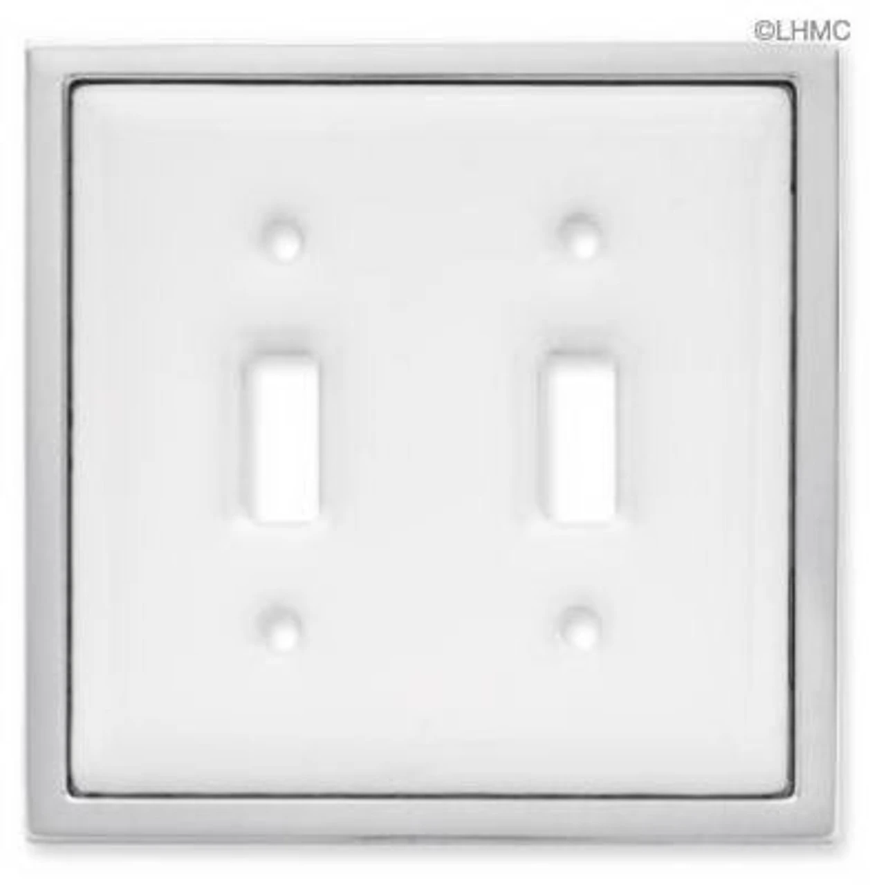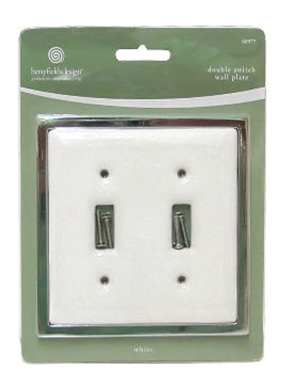 Casual Collection Betsy Fields Design Switch plate in white ceramic and chrome trim. This wall plate cover with a touch of chrome is very classy and classic. This heavy and highly attractive ceramic double switch wall plate with a chrome border will be perfect for your home renovation project or at the office. The additional chrome frame makes this cover 1/4″ larger than standard covers,just like some of the fancy decorative wall plates, so it would handily disguise a little damage around the switch box if need be. Comes with 3/4″ mounting screws Liberty Hardware Limited Lifetime Guarantee This wall plate is for standard wall toggle switch.