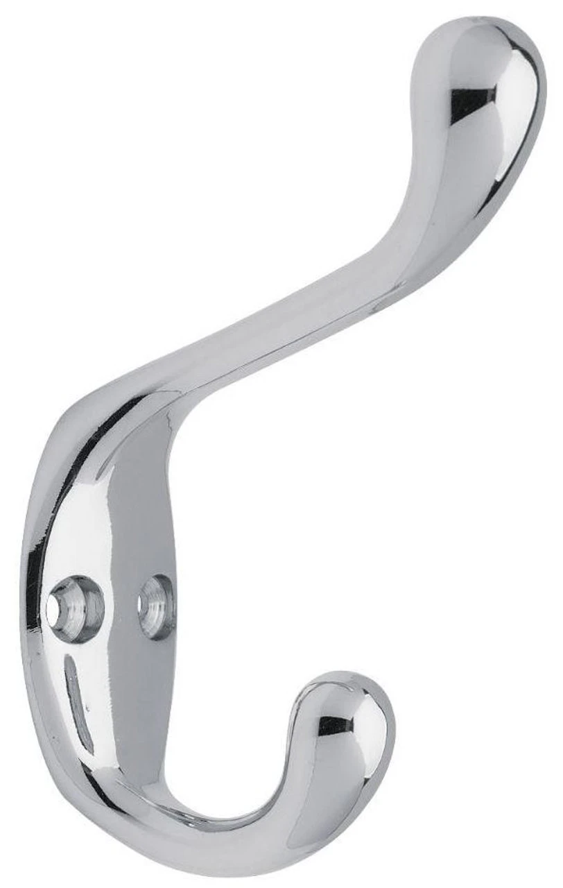 Hook heavy duty two prong coat hook front mount chrome finish. Thick design accommodates heavy garments. Zinc diecast base material.