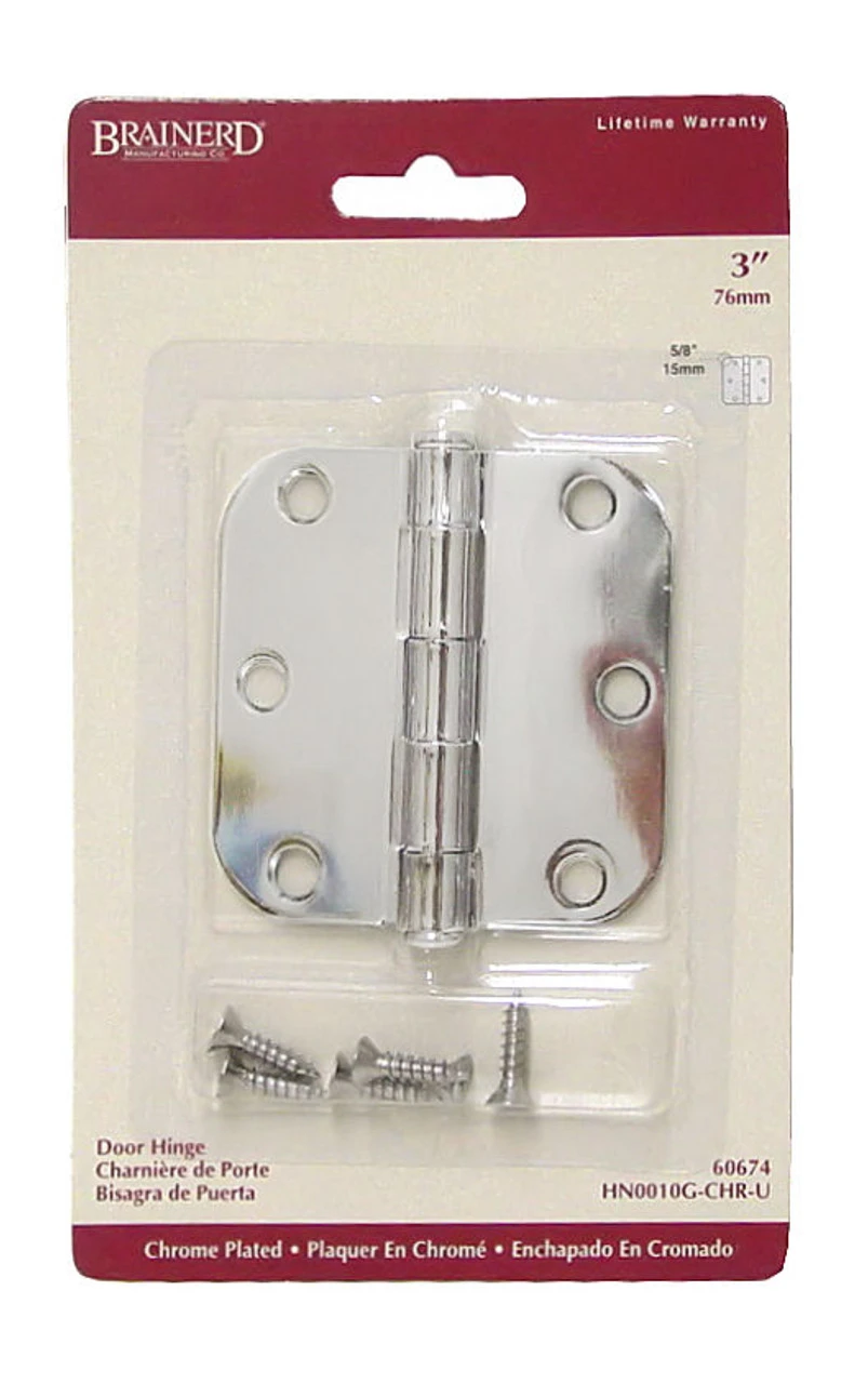 3″ Chrome Door Hinge With Round Corners. Carded with screws and mounting instructions. 1 per package. Classy looking hinge will enhance your other chrome hardware.