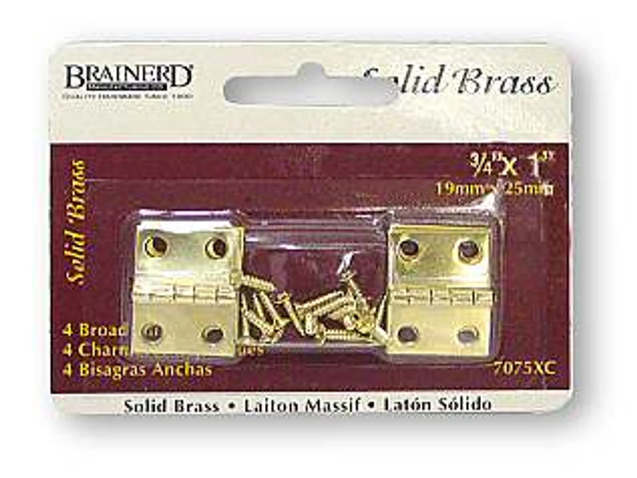 Classic solid brass broad hinge. Great for use on small doors, cabinets, or chests. Comes in a sealed, hangable package of 4. Screws are included. 3/4″ wide x 1″ tall (19mm x 25mm).