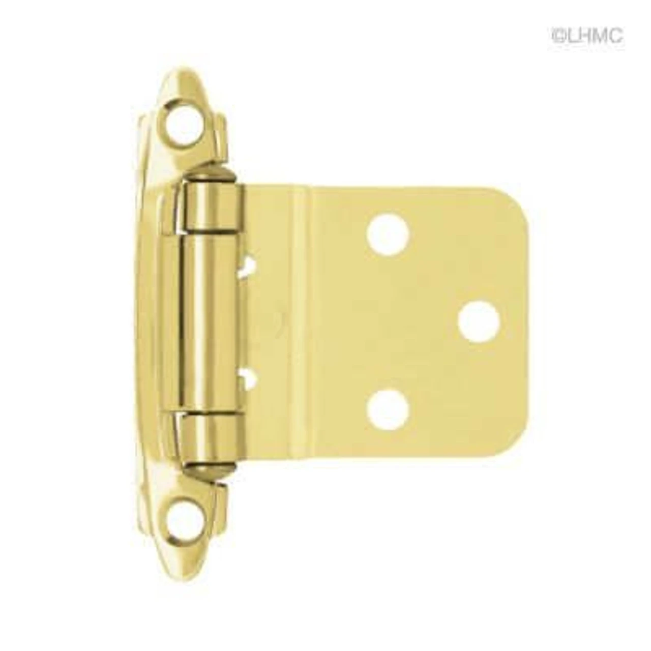 Surface Mount Hinge – 3/8″ inset – semi concealed, self-closing – brass plated. Comes with screws and bumpers. Priced in pairs.