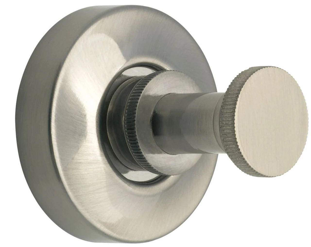 This stylish hook in satin nickel is no longer in production and will soon run out because of it’s style and utility. This hook is a true beauty and looks great in practically any application. In the additional images you can see it in use on the super popular DIY and decor blog Infarrantly Creative in a bathroom makeover. The hooks are perfect for holding heavy towels and not getting in the way. 2″ diameter base. 2 7/8″ projection. Comes with mounting hardware. Liberty Hardware