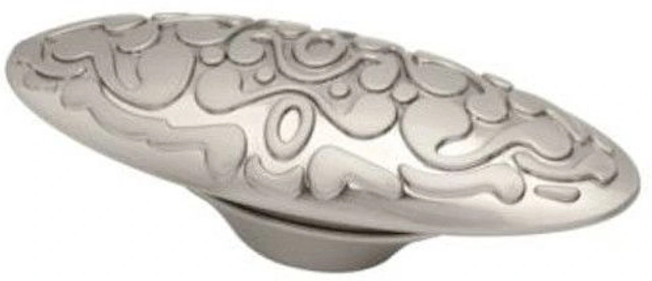Satin nickel scroll pull with an intricate beautiful design embossed into the metal This is the length of a pull but mounts with a single screw like a knob.