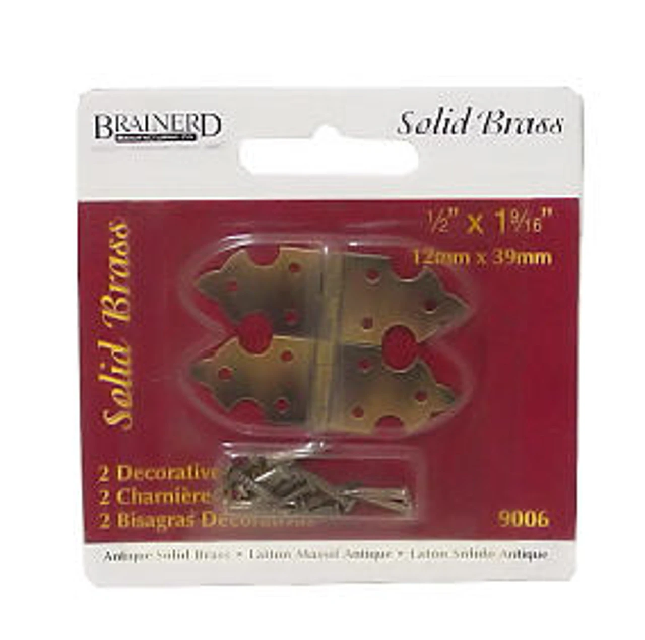 Solid antique brass decorative miniature hinges. A pair of small hinges for jewelry boxes or where a small hinge is needed. 1/2″ wide x 1 9/16″ long with an antique brass finish. Brainerd Hardware