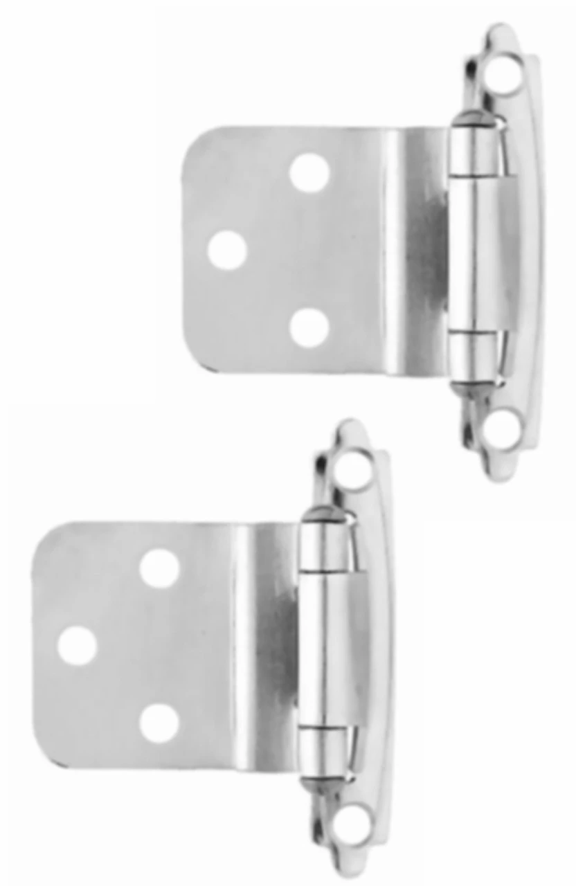 Matte Chrome Pair Semi-concealed, Self-closing, 3/8″ inset/offset hinge. These Matte Chrome hinges are a perfect match to our matte chrome knobs and pulls, and a close match for satin nickel or stainless steel hardware. Maybe not a perfect match, but thousands of customers have found these to be the most economical and suitable choice. They also look good with Brushed Satin Pewter finishes, but of course, do not have the black element of this finish. Sold as a pair. Comes with screws.