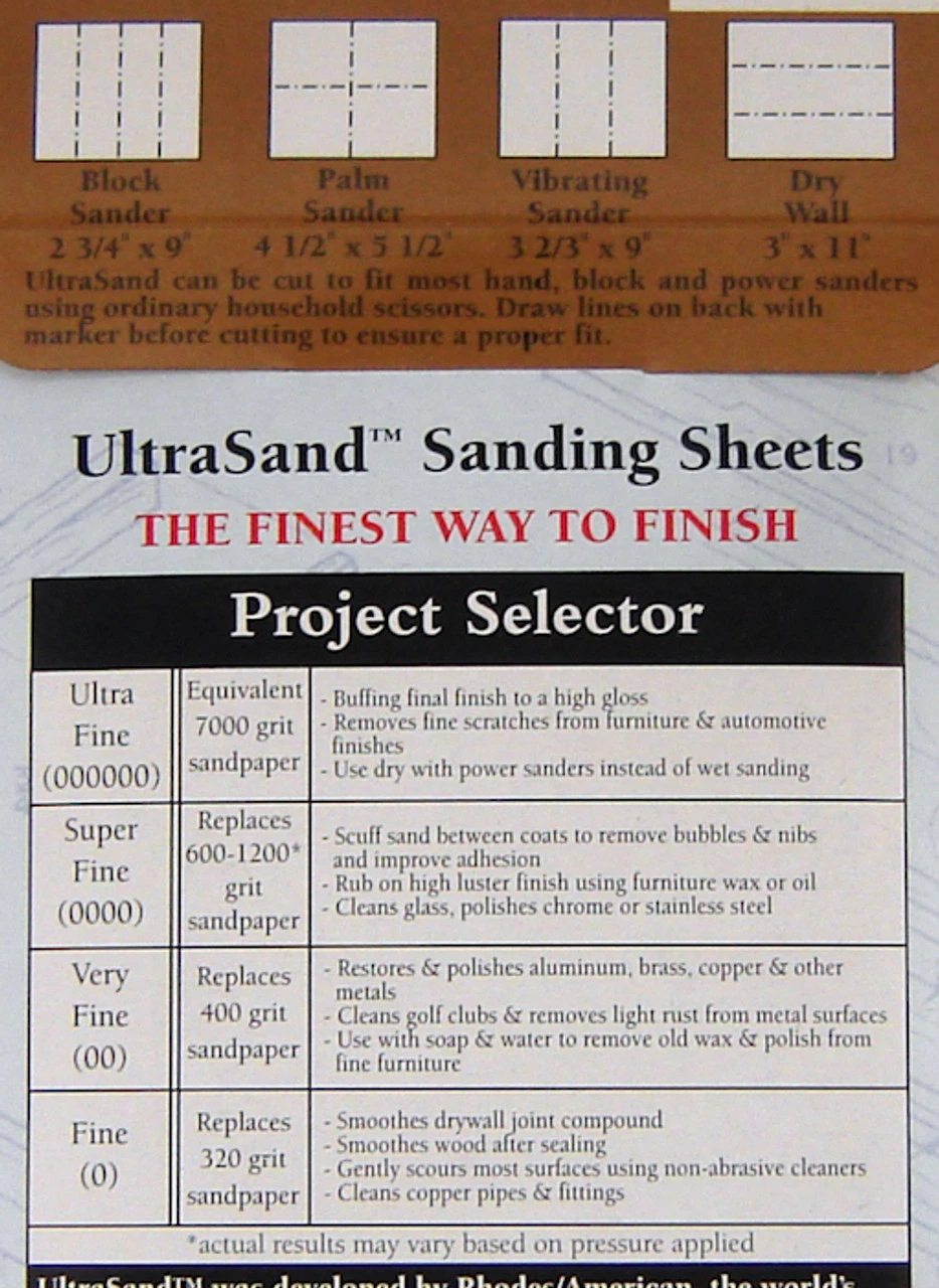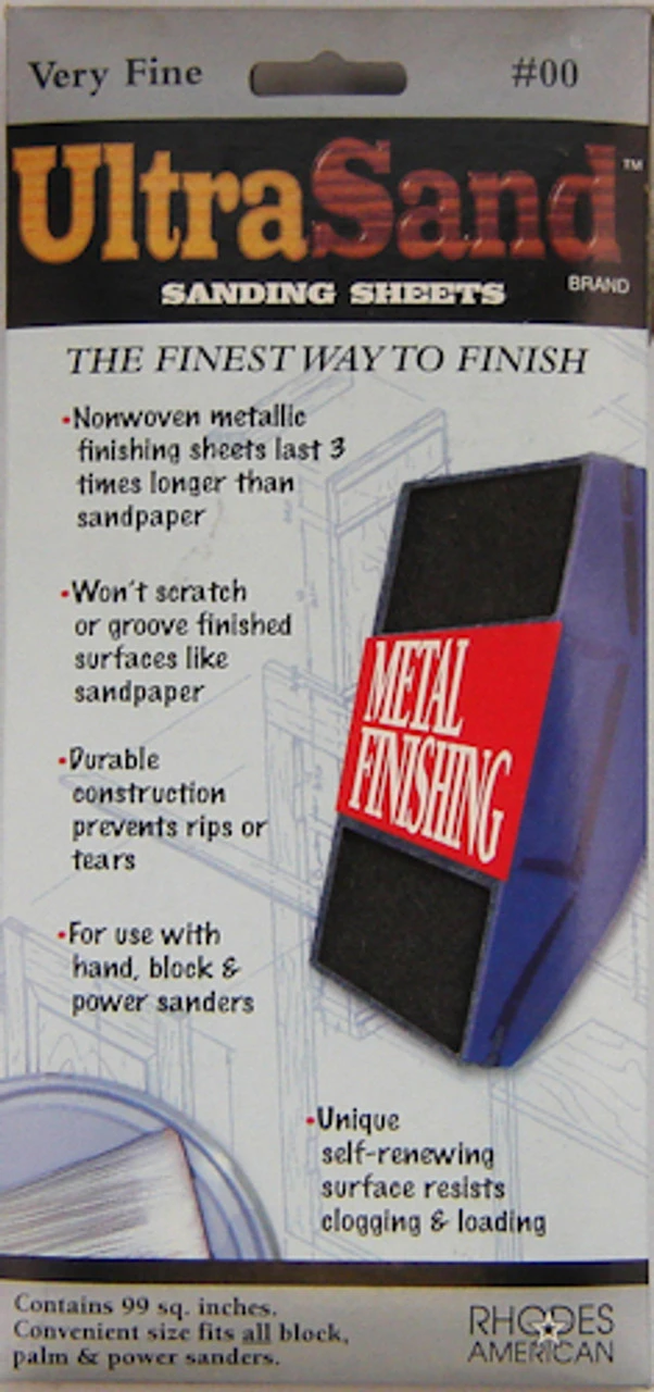 UltraSand was developed by Rhodes/American, the world’s largest manufacturer of steel wool and a leading innovator in abrasive and filter technology. Utilizing a revolutionary manufacturing process, steel wool and synthetic fibers are fusion bonded, creating a material with unparalleled strength and flexibility. UltraSand outlasts and outperforms ordinary sandpaper and other abrasive products, making it “the finest way to finish” any stained, painted, varnished, shellacked, or clear coated surface.